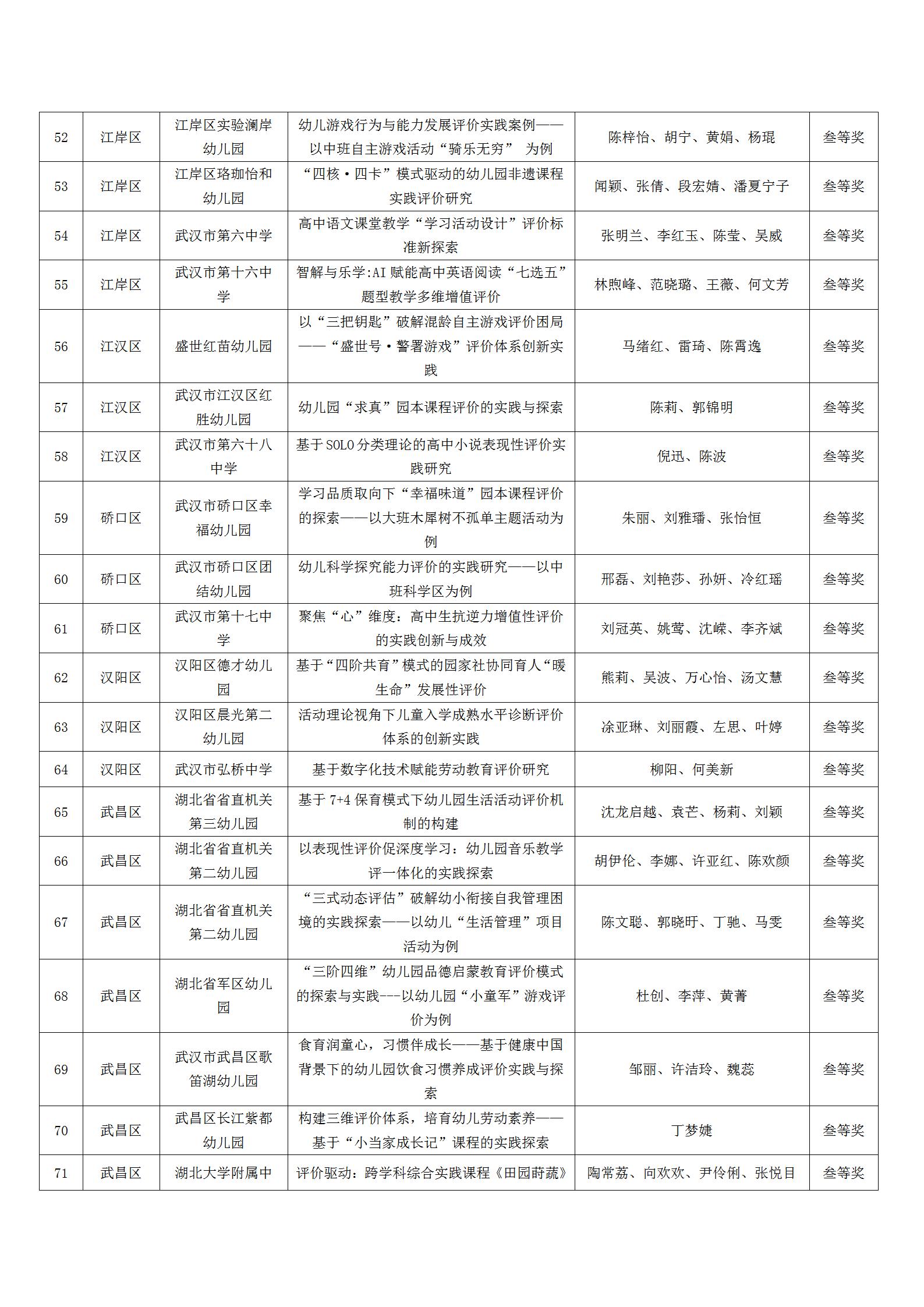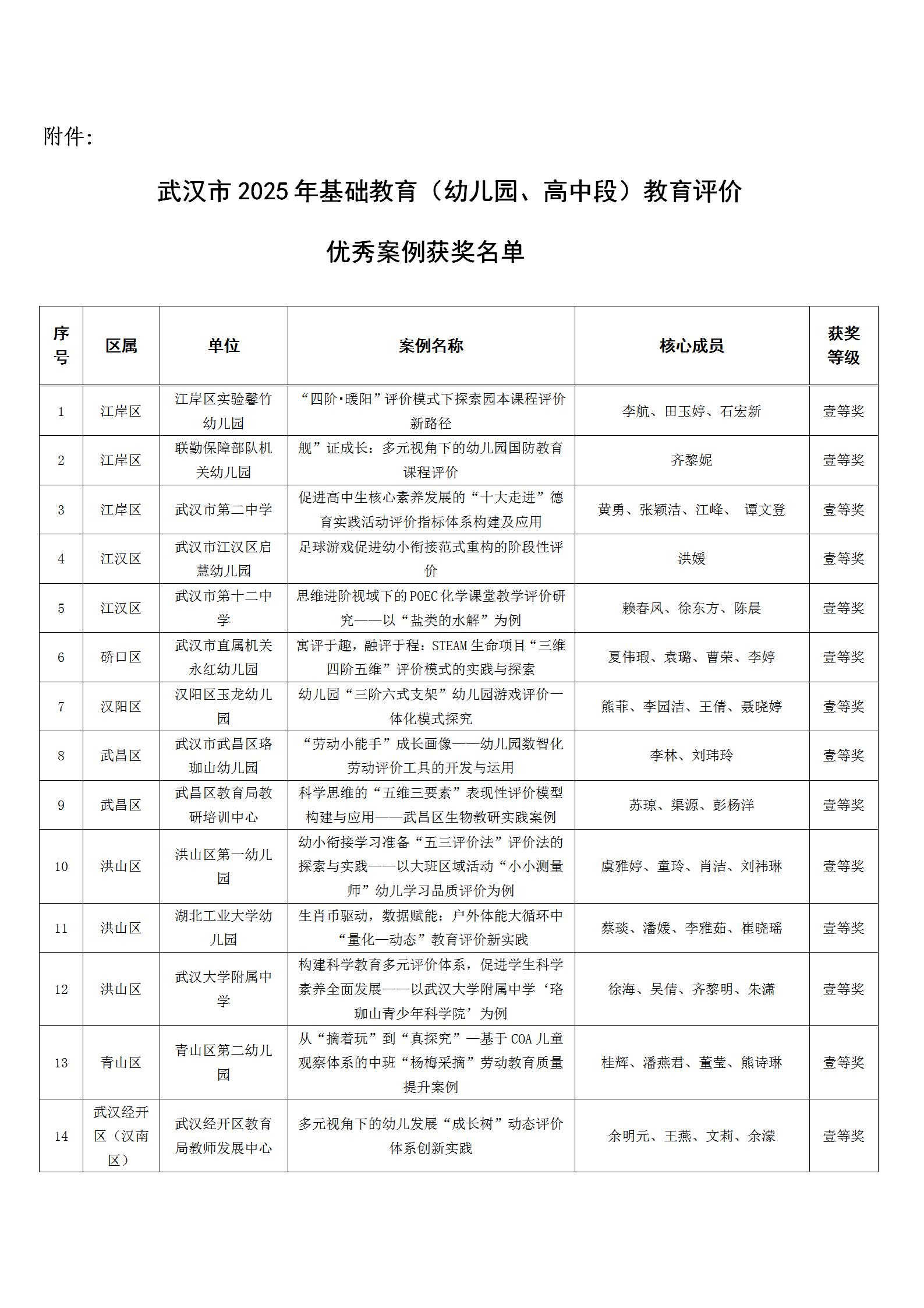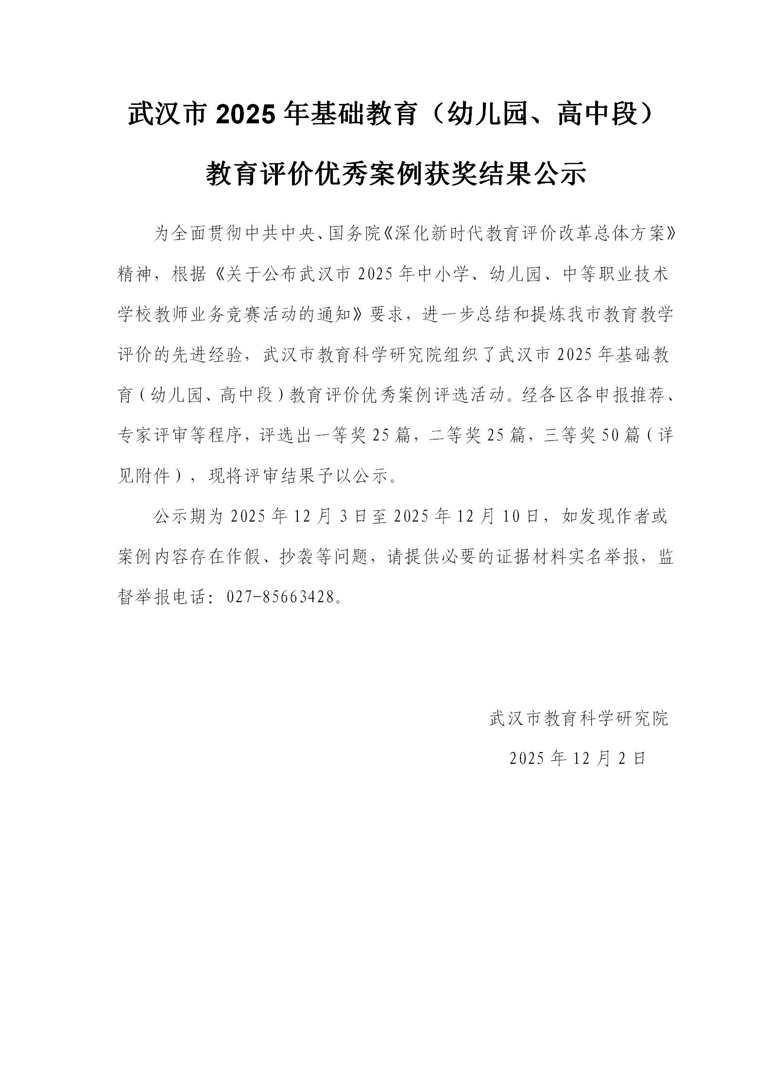 武汉市2025年基础教育(幼儿园、高中段)教育评价优秀案例获奖结果公示