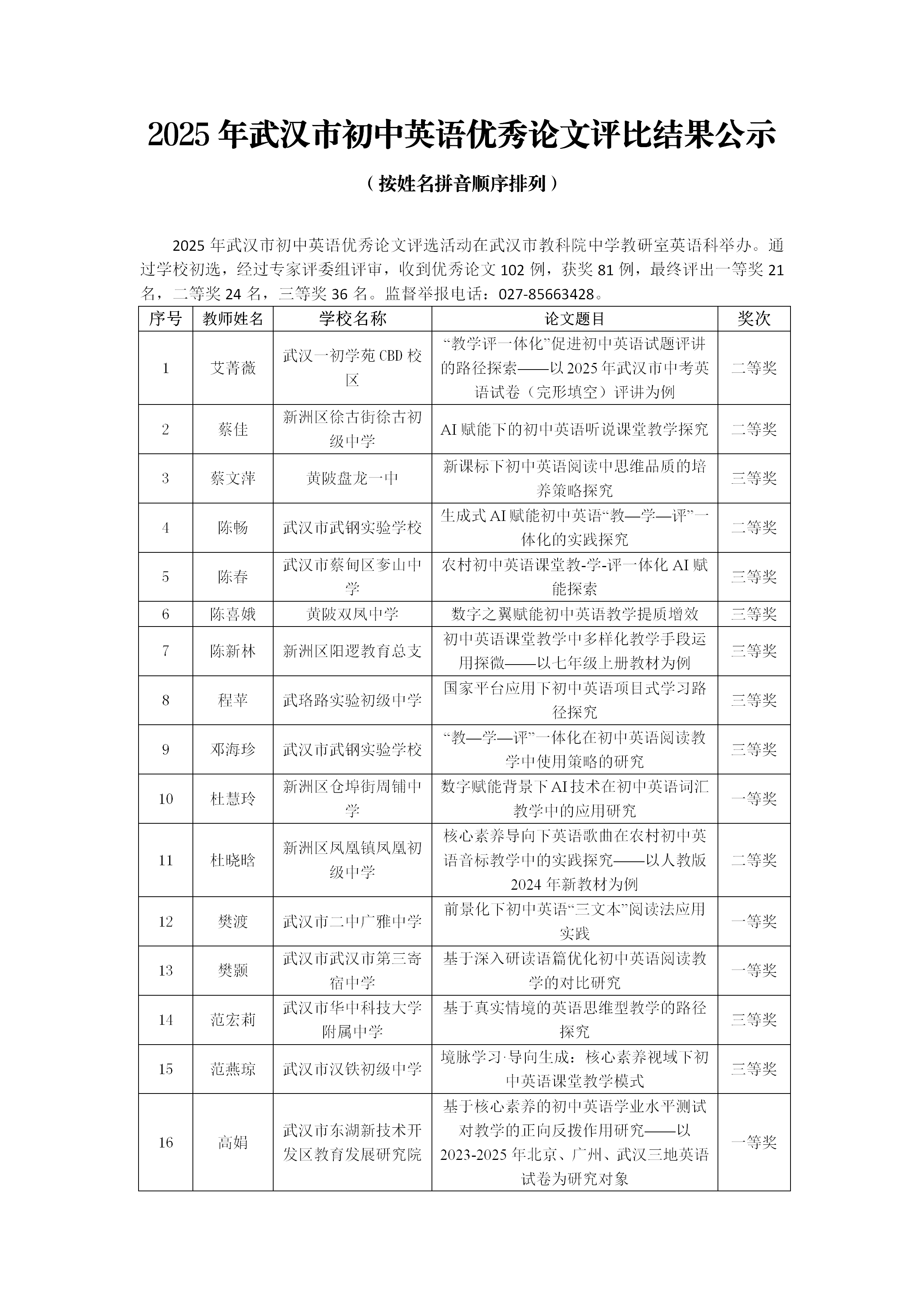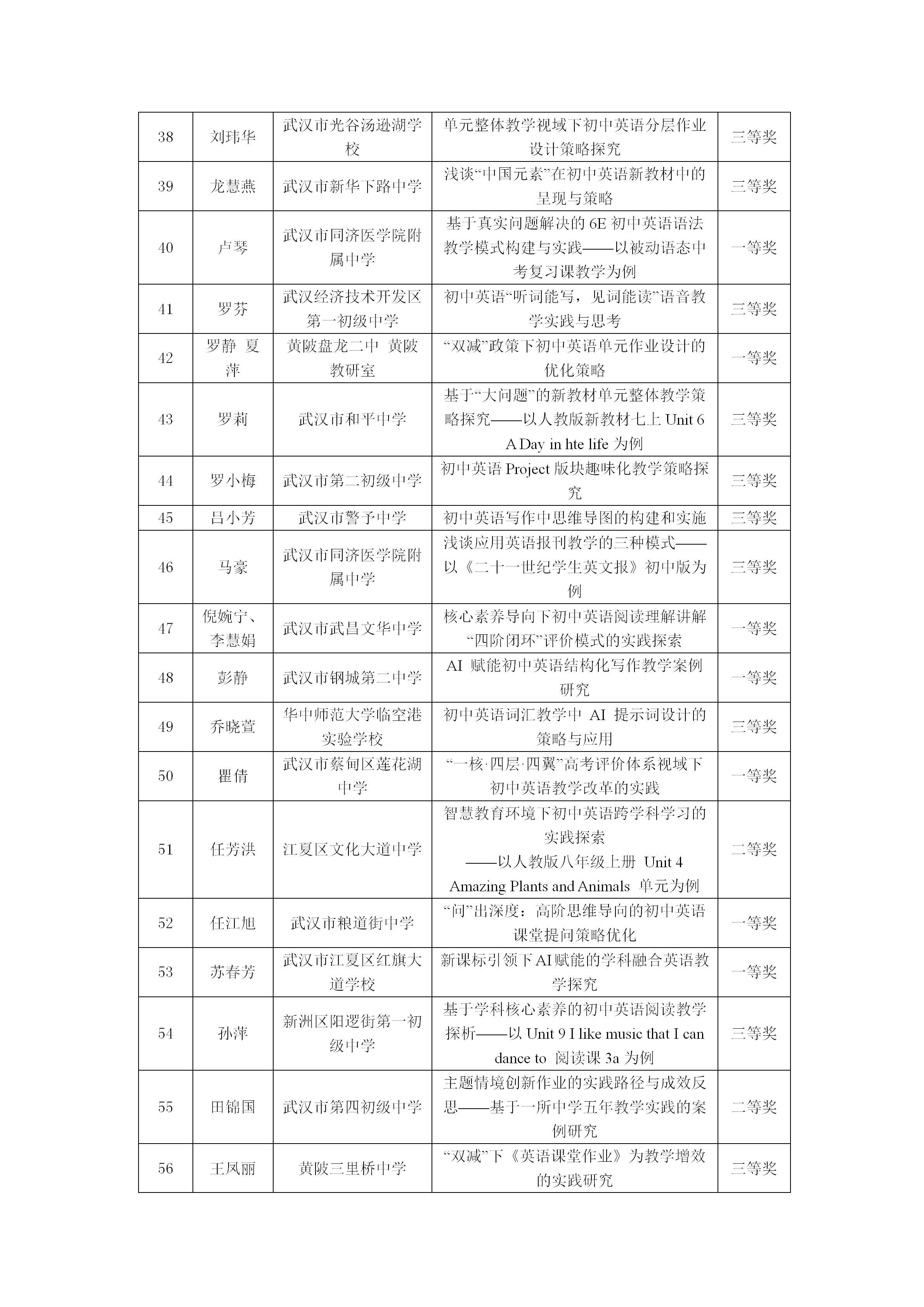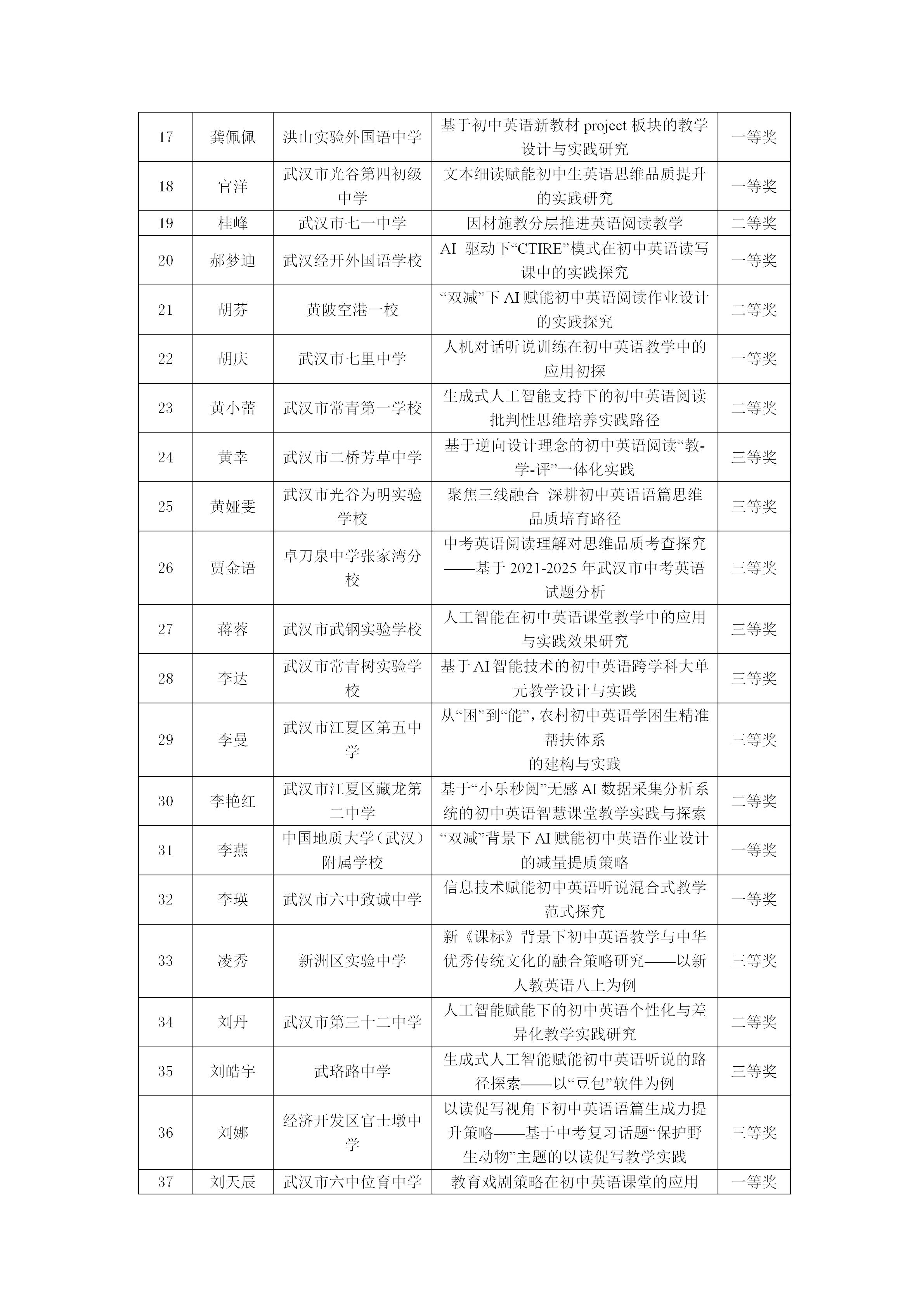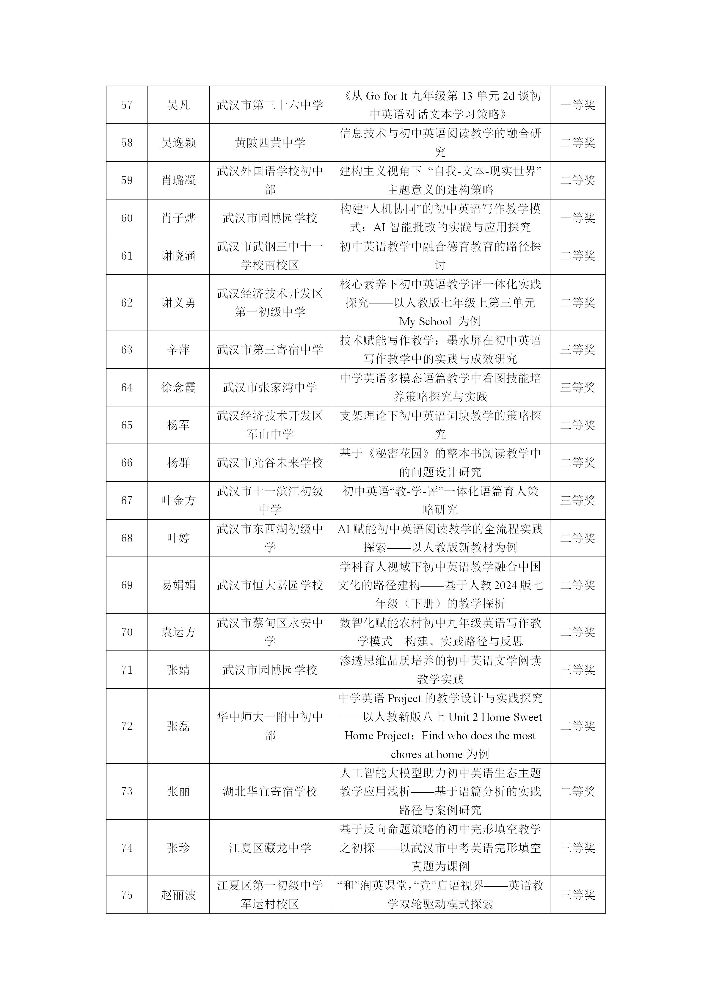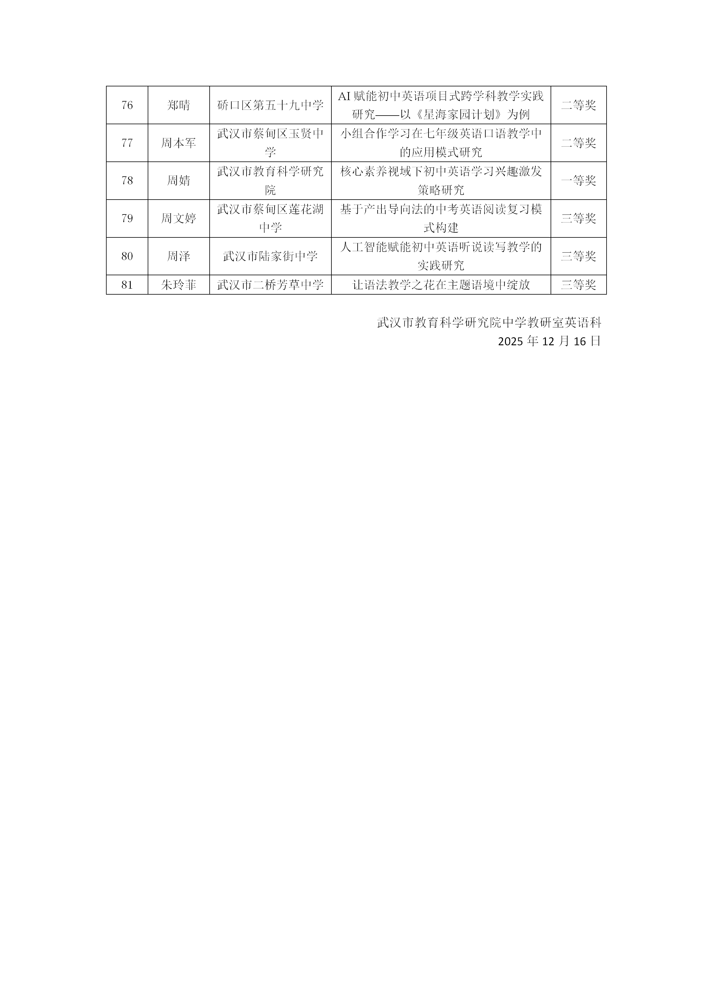 2025年武汉市初中英语优秀论文评比结果公示